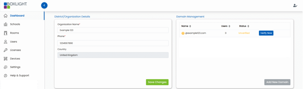 The Boxlight admin portal is designed for IT or District administrators to manage MyClass and FrontRow users and licenses. It can be used at a single school or multi-school / district level depending on the scale at which the solutions are adopted. Licenses and Users can be assigned licenses based on district, school, room, or custom tags.